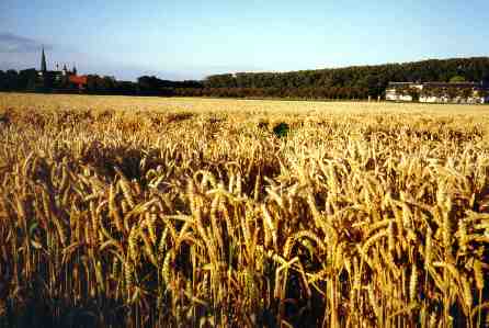 | De gouden glans van het graan, de kerk en het kasteel, en op de achtergrond het bos. Geulle straalt vriendelijkheid en rust uit. |